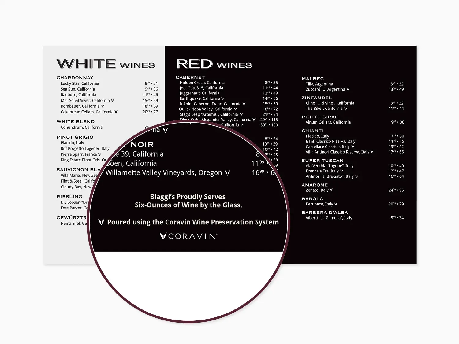 Promote your new menu by including callouts such as, Pours by Coravin or Wines by the Glass with Coravin.